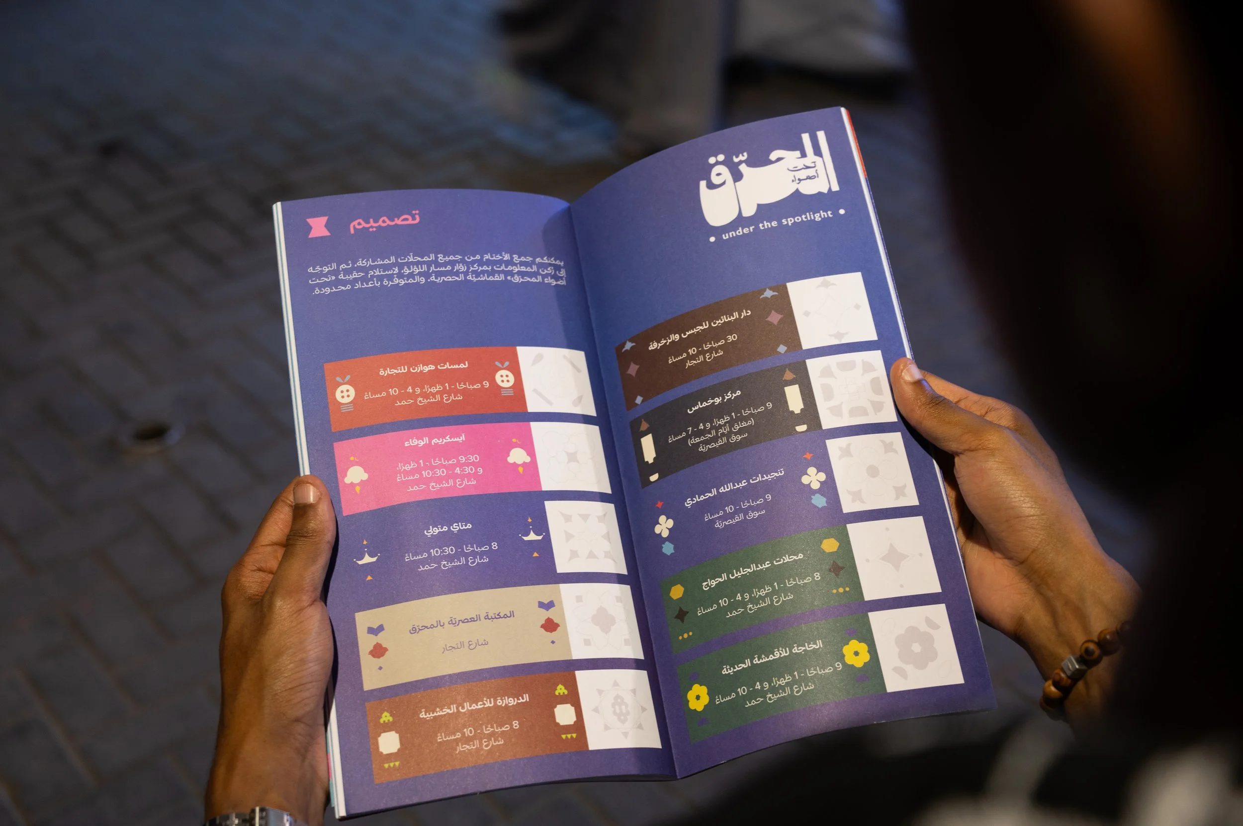 Under the Spotlight (تحت أضواء المحرق) is a project that highlights existing shops within the souq and the surrounding urban fabric as active participants in Muharraq Nights. The initiative introduces interactive layers that connect the commercial and social components of the urban environment, encouraging visitors to engage with shop owners, employees, and the spaces themselves through visual and physical placemaking interventions.